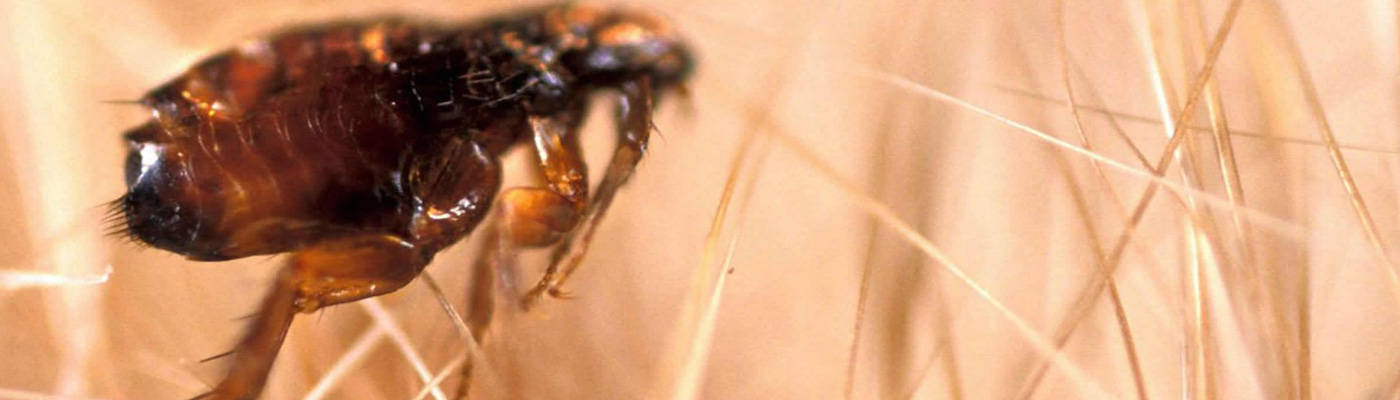 Fleas are outdoor parasites that live by feeding on blood off mammals and birds. Adult fleas are very small insects (about 1/16” long), dark reddish-brown and wingless. They have three pairs of legs, and their longer back legs make them excellent jumpers. Fleas can jump thirteen feet horizontally and seven feet vertically. The flea’s body is hard and covered with hairs and spines projecting backward, and they have a piercing-sucking mouthpart used to obtain blood meals from a host.